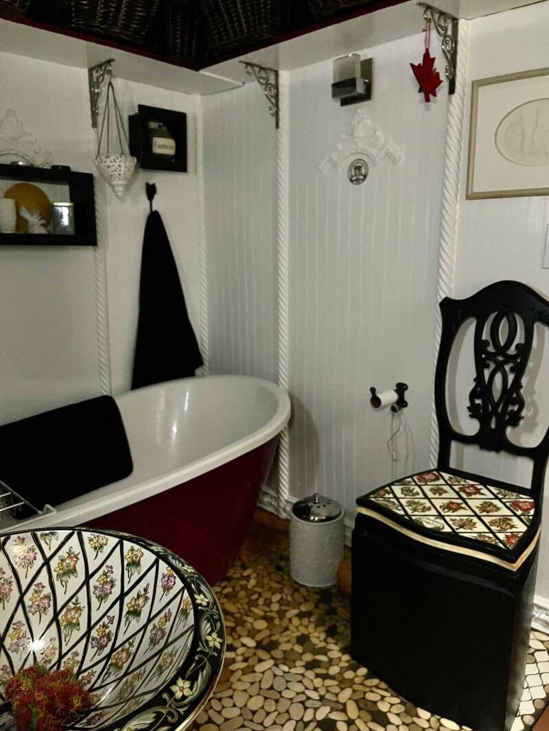 Inside, the Living/Sitting room area of the Great Room measures 8’1” x 96”. The Dining/Kitchen area of the Great Room measures 8’1” x 143”. The bathroom ~~ which includes a standard sizevsoaker tub, reproduction of an antique commode converted to a compost toilet and Italian painted Chinese water porcelain sink ~~ measures 8’1” x 5’7”. The bedroom wall-to-wall and including the built-in bed Oriental box bed nook measures 8’1”x 11’ 2 1/2”.
