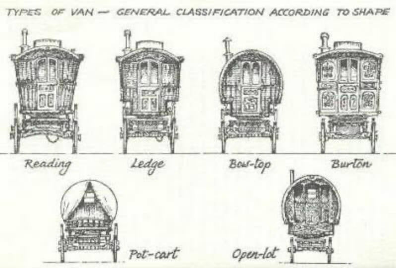 There are five main types of Gypsy and hawkers' living-waggons. These include the Bow-topped Waggon, two versions of which were the Spindle-sided Potter's Four-wheeled Cart and the Two-wheeled Sleeping Cart which was used by the Staffordshire salt-hawkers. Other types included the the Cottage-shaped or Ledge Waggon, the Brush Waggon and the Straight-sided Waggon which was also known as the Showman's Waggon. It was probably in the Reading Waggon or the old type of Gypsy vardo, however, that the Gypsy waggon reached its highest and most characteristic form. This was a waggon with large wheels running outside the body of the van, which slopes outwards considerably towards the eaves. During the heyday of the vardo the family most widely reputed as builders were the Duntons of Reading. The vardo became the Gypsy woman's most coveted possession, the paramount domestic status symbol. While most Romani have gone over to trucks and trailers and despite the fact that only about one per cent of the traveller population still live in horse-drawn waggons, the tradition of the vardo is still very much alive as can be witnessed on an annual basis at the large fair in the town of Appleby, Cumbria, every summer.