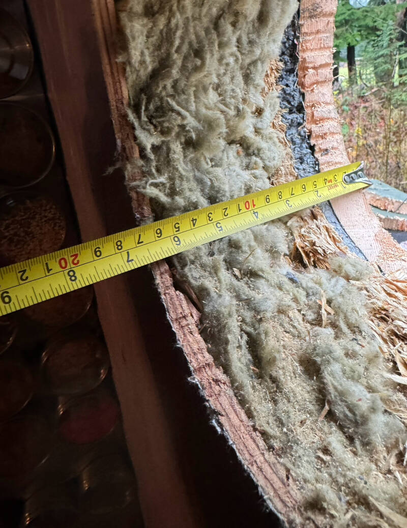 1/2” plywood wall board inside, then 4” of rock wool insulation, then 1/2” construction exterior plywood, then exterior 1/2” thick SilVerBoard insulation,, and finally 1” Douglas Fir Board&Baton (meaning where each Baton strip is the exterior wall is 7” thick!)